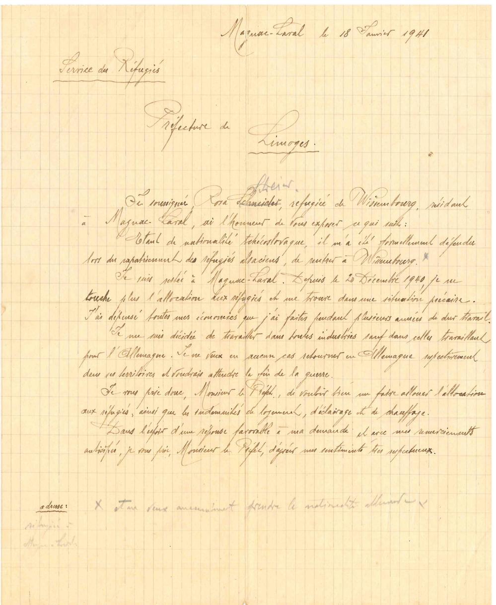 Parmi les derniers documents donnés au musée de la Résistance, on compte une lettre adressée au service des réfugiés de la Préfecture de Limoges le 18 janvier 1941 par Rosa Schneider (son nom de famille est barré sur la lettre).